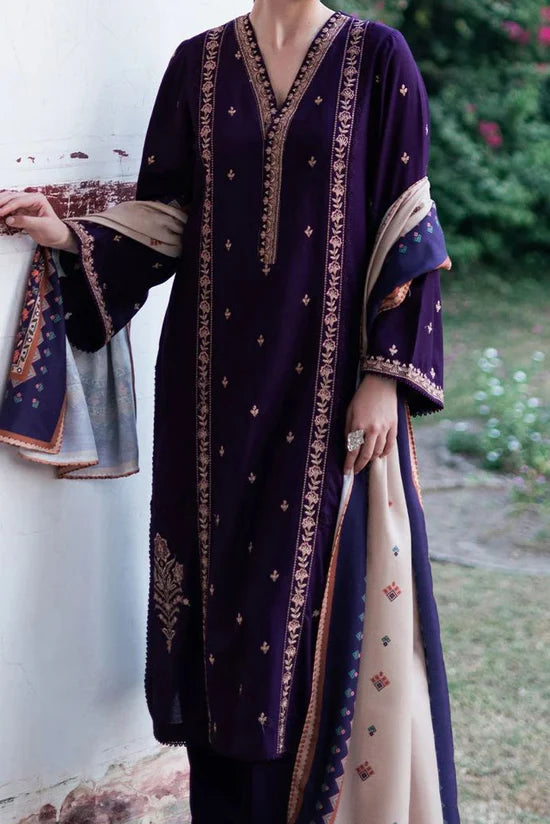 Dhanak Chikankari Emb Shirt Dhanak Embroidered Sleeves Dhanak Embroidered Trouser Coutrai Wool Print Shawl Dhanak Dyed Back Unstitched 3PC Dress